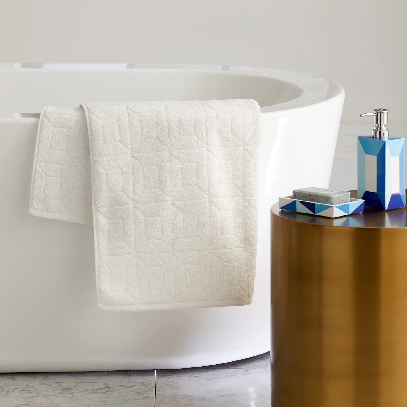 Spoil yourself with our luxe Sorrento bath linens. Designed for the ultimate at-home spa experience, each towel and washcloth is spun from our signature Wonderluxe Turkish cotton. They’re the new thick, soft, and long-lasting loves of your life—you’ll never want to unwrap. In chic solids featuring the outline of our Sorrento pattern. Just add a Mediterranean daydream.