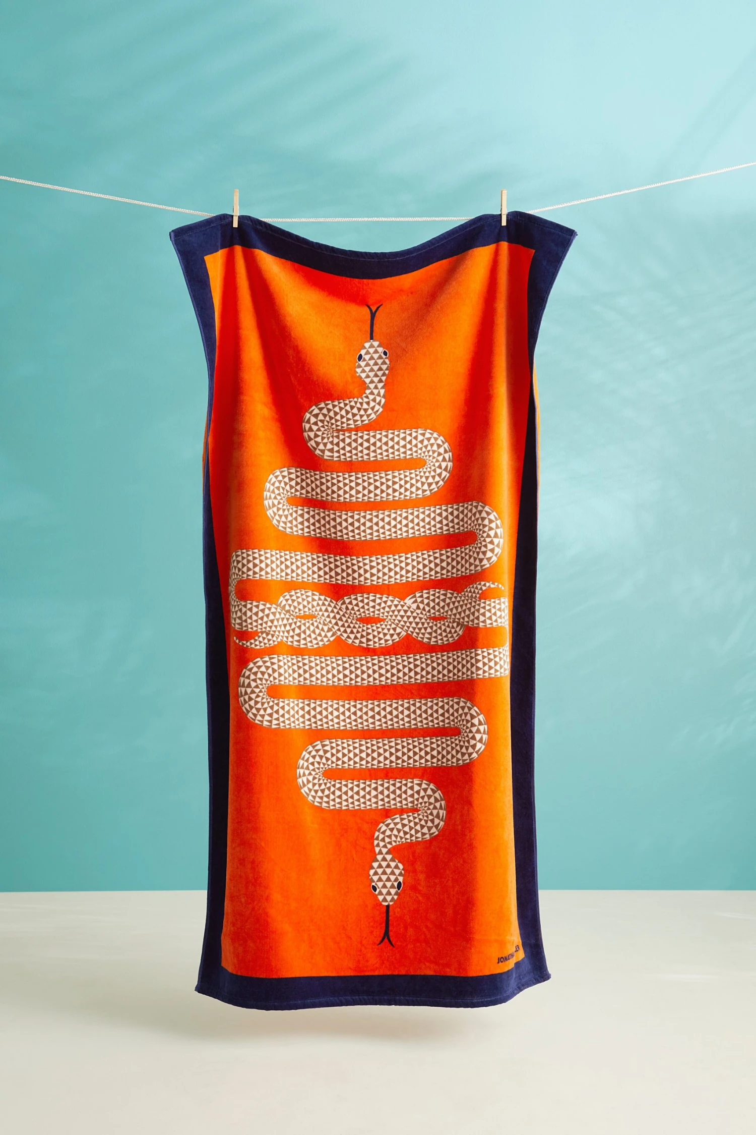 Channel the spirit of resort glamour with our generously sized, thick and thirsty beach towels. Ooze beach chic with a shimmering pair of gold serpents on bright poppy orange. White sand beach to infinity pool, they look as good draped across a chaise lounge as they do wrapped around your shoulders.