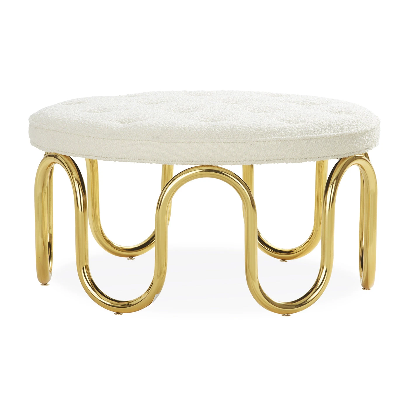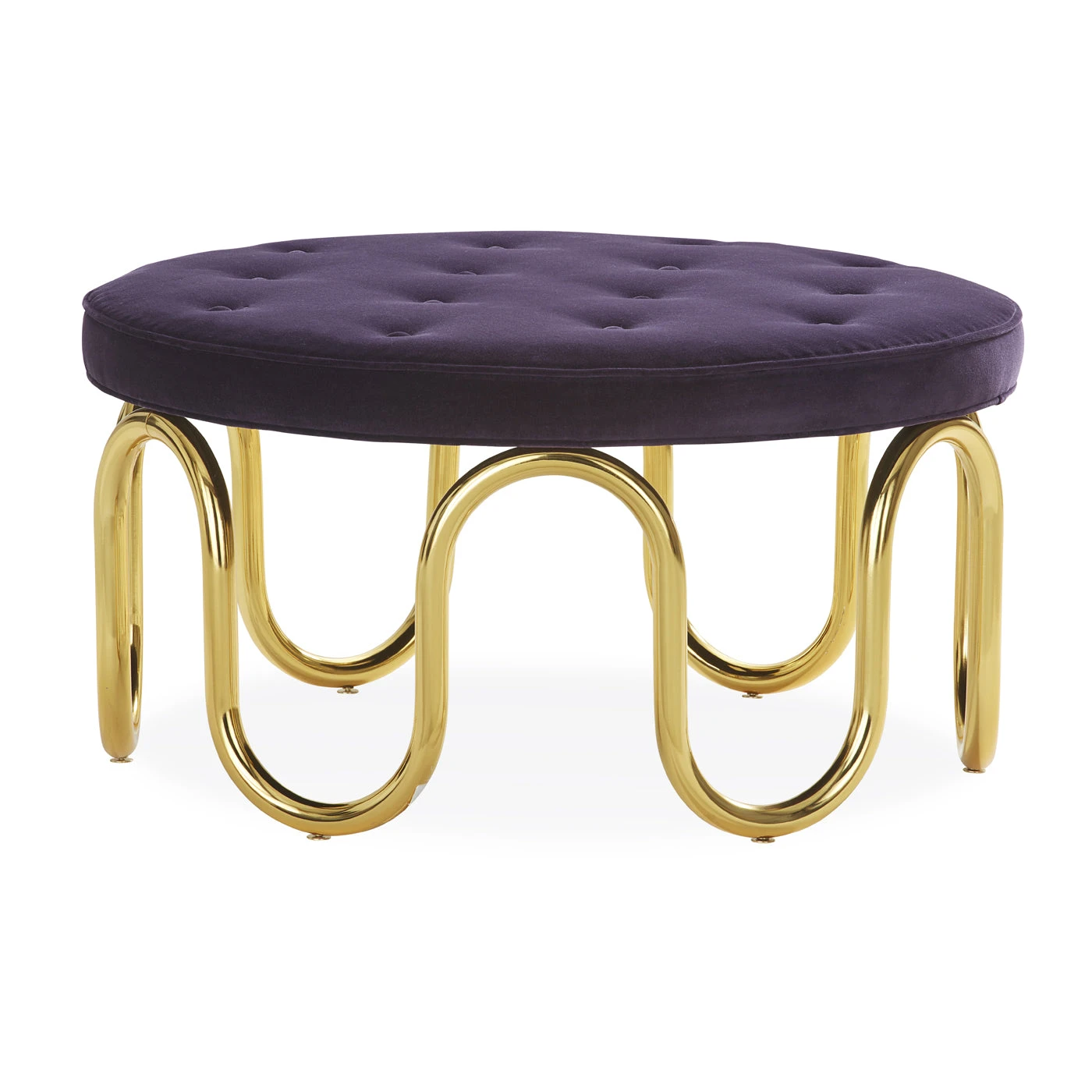 Made from a sinuous brass tube base topped with a circular cushion finished in Olympus Ivory bouclé or Venice Aubergine. Simple form, luxe feel, memorable twinkle. Top it with a tray for extra tablespace. At home in a fantastical hotel in Capri or a Park Ave penthouse.