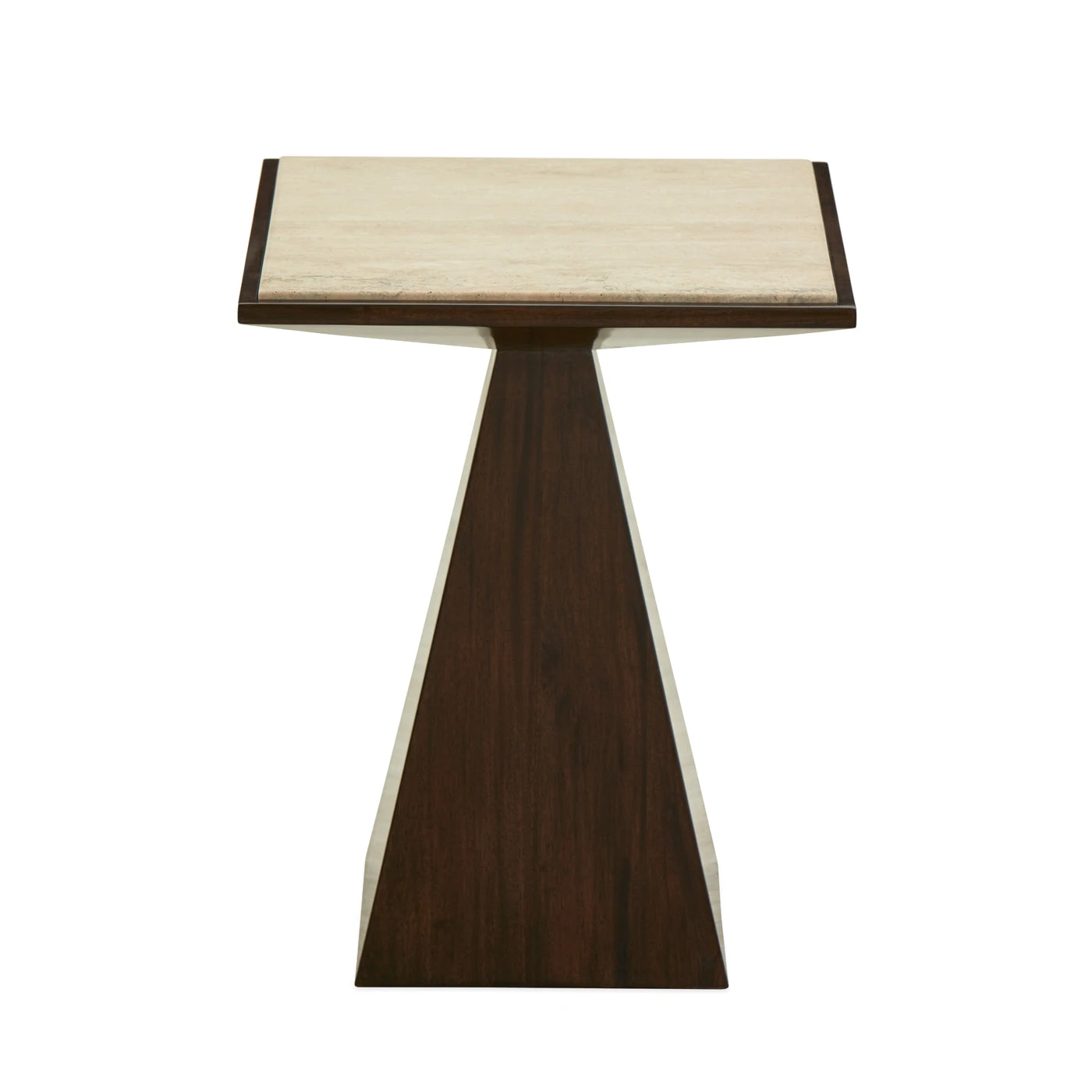 Our Buenos Aires Square Pedestal Accent Table features geometric forms made from a solid mahogany base polished with a gloss finish and a simple square tabletop. The rich wood tone is complemented by a travertine stone (warm, full of character, and known its signature natural tones) top, sealed, waxed, and polished for a hardworking finish. A chic companion for your favorite chair, and the perfect perch for a cocktail.