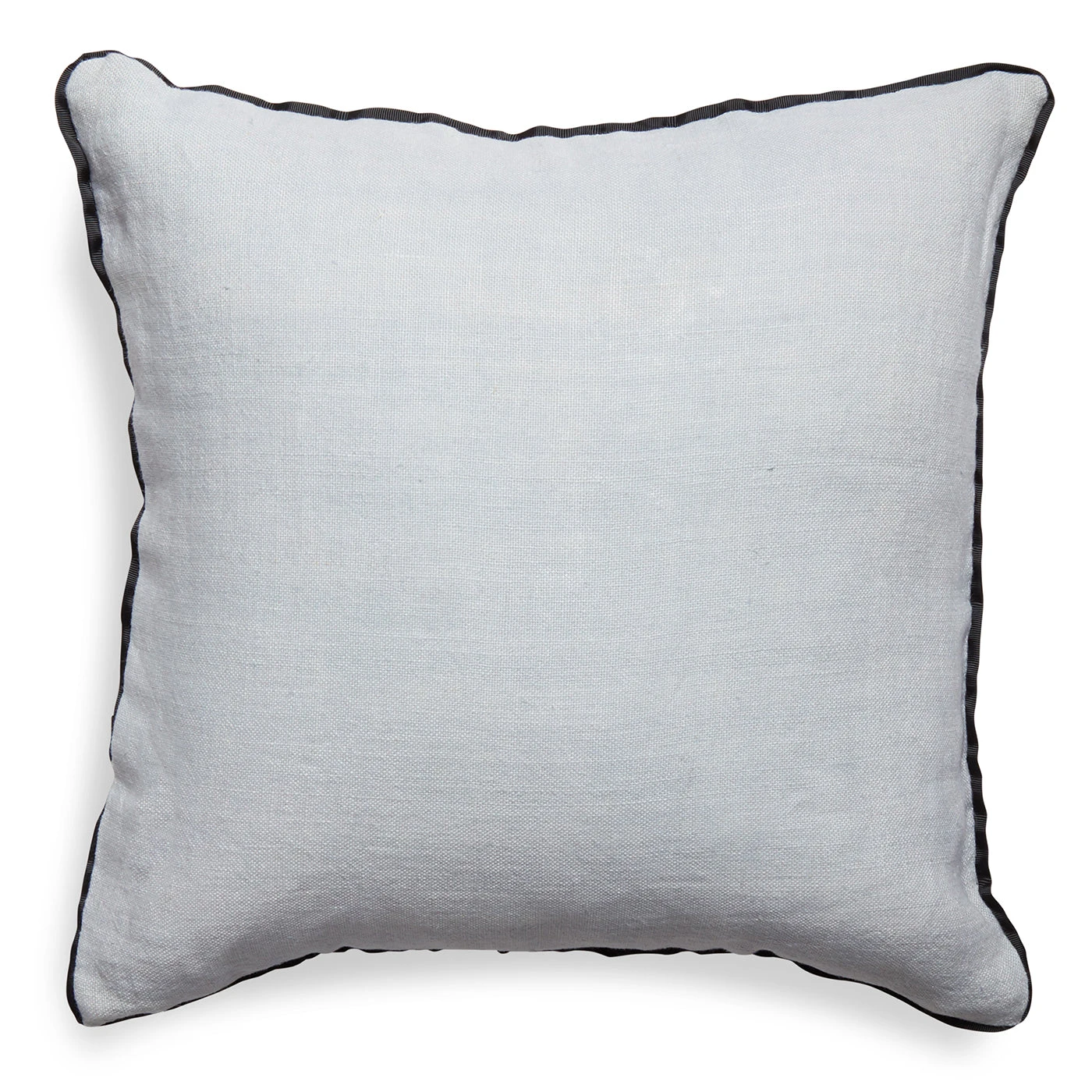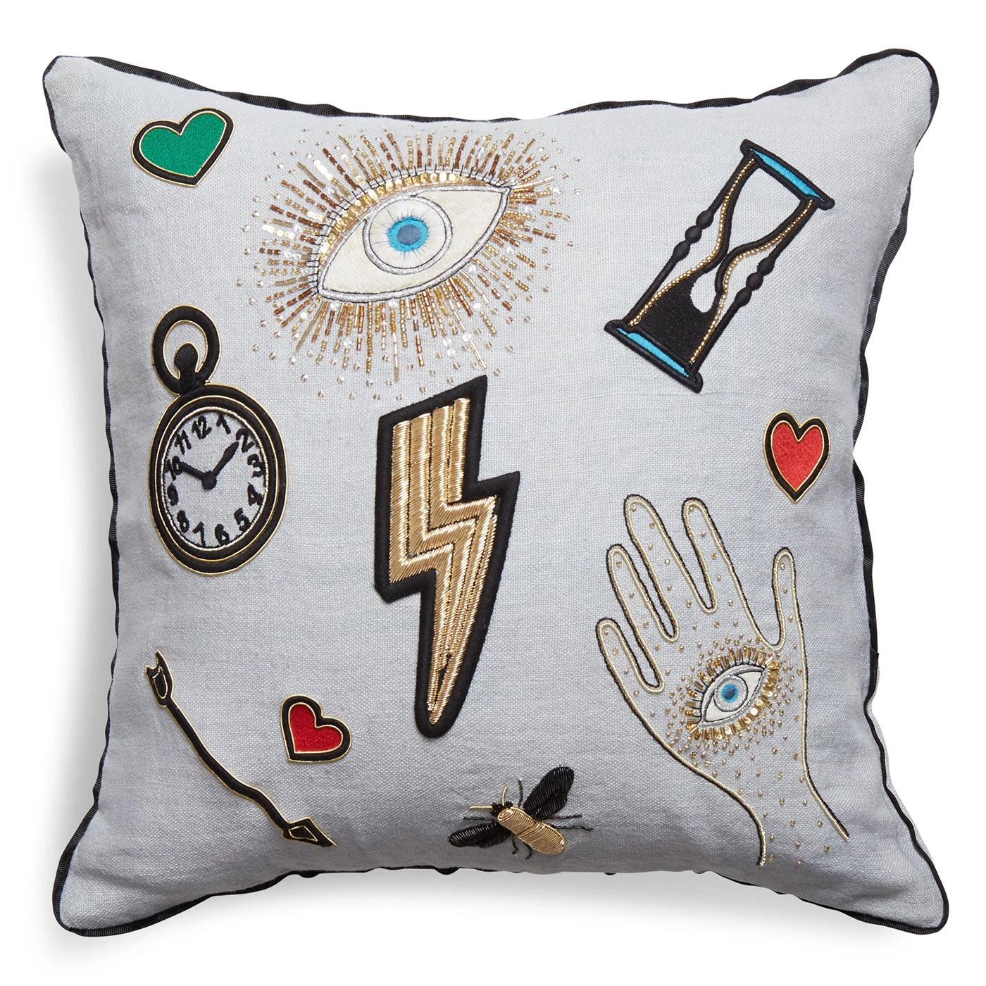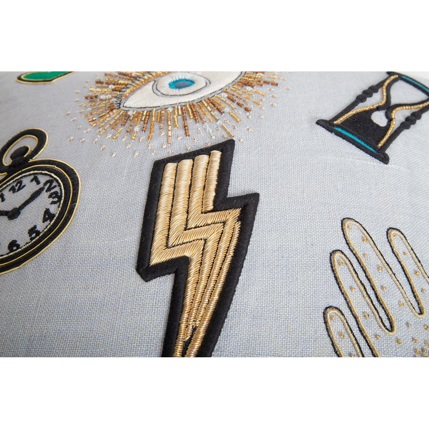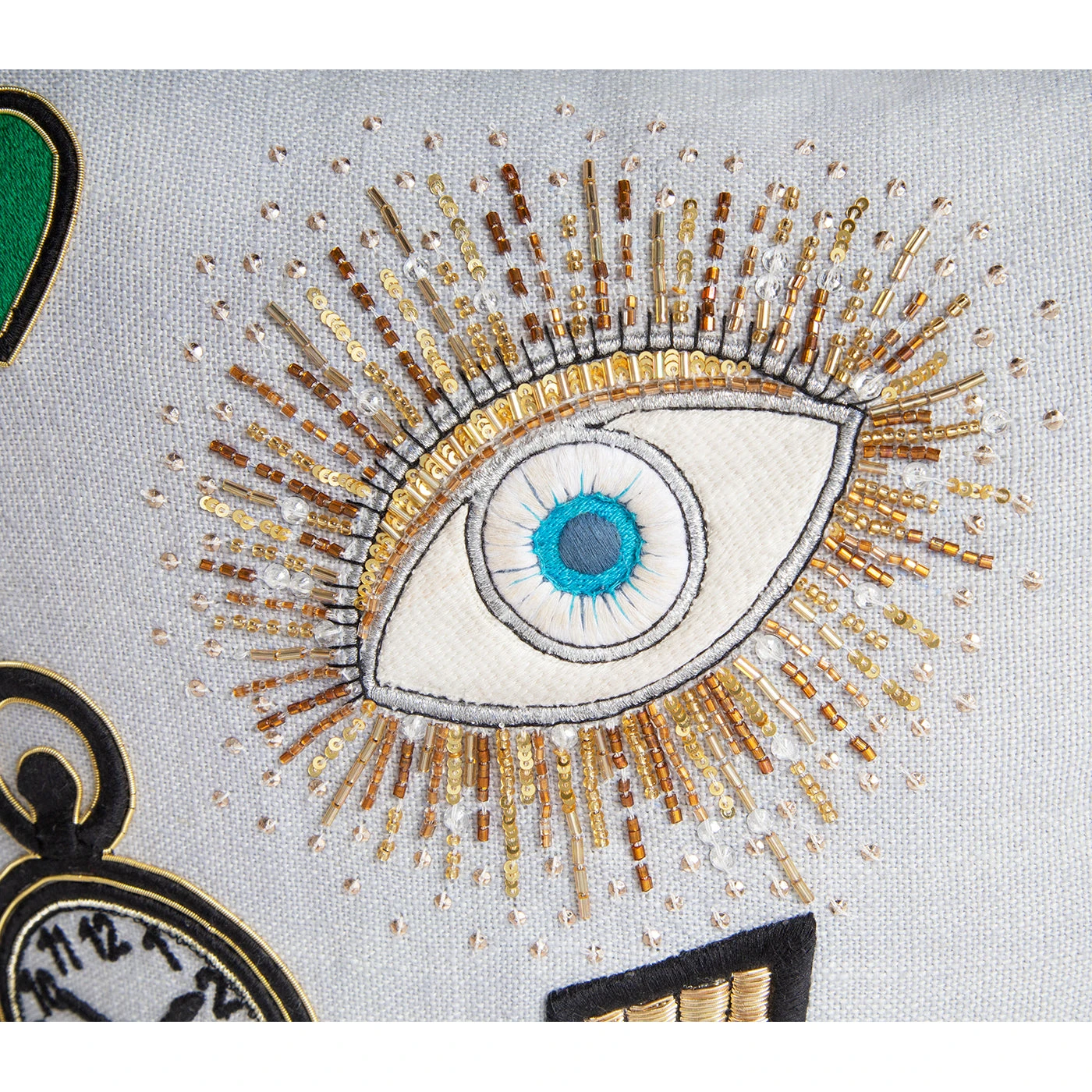 Evocative icons embroidered on light, sky blue linen. Hand beaded and adorned with sparkling gold threads, our Bijoux pillows are dreamy and provocative. Just the edgy glamour every eccentric pillowscape needs.
