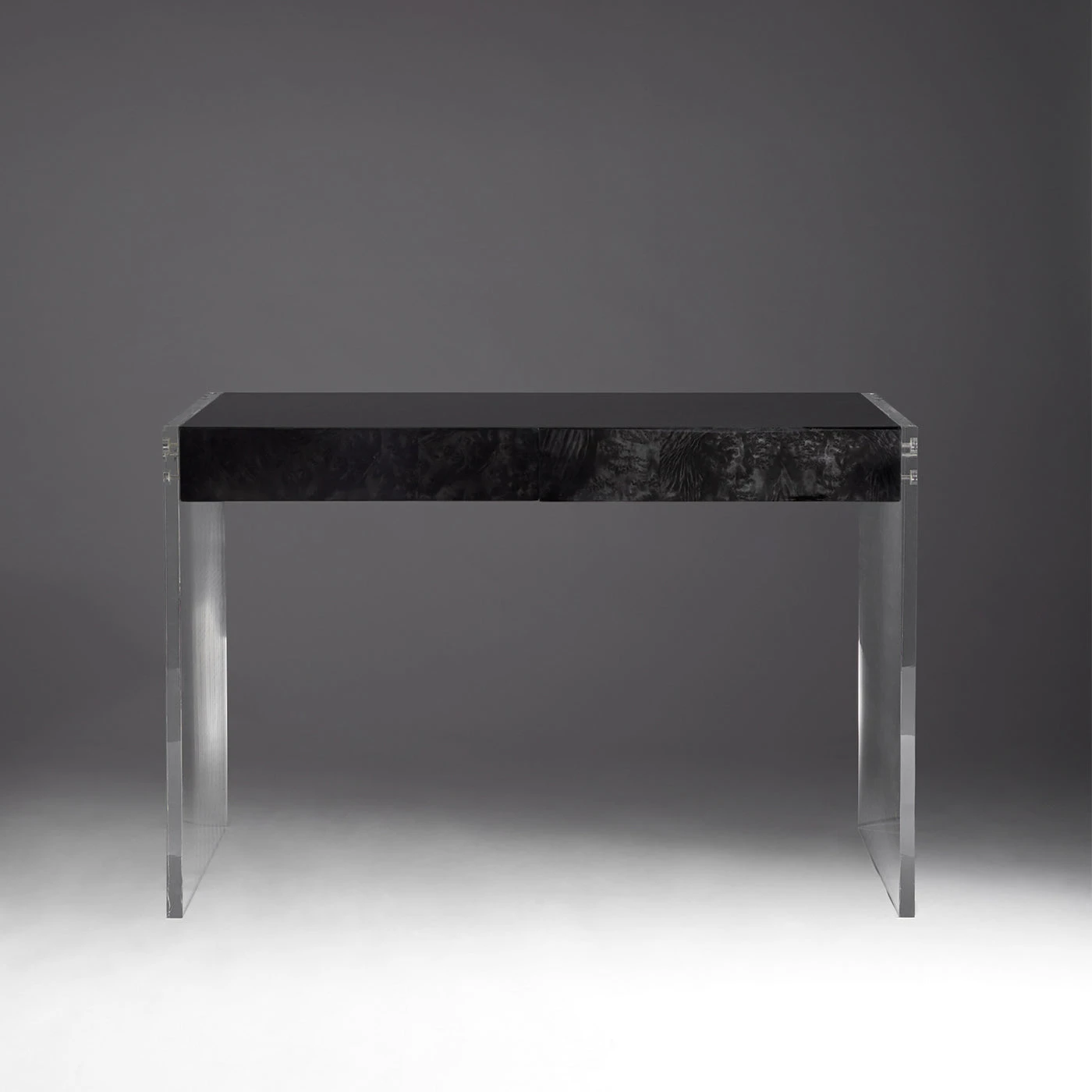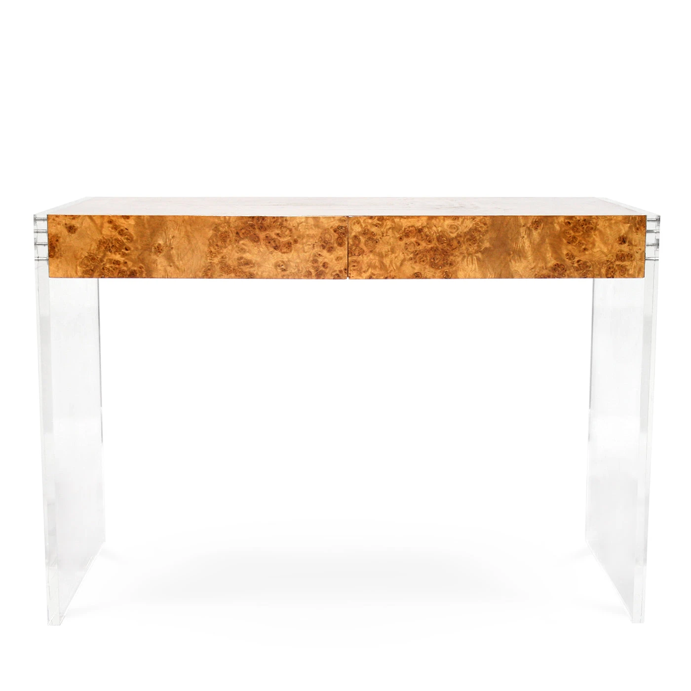 Architectural rigor meets the warmth of burled wood in our Bond collection. Pieced mappa wood floats between clear acrylic legs with shiny stainless steel accents. Fully finished drawers with hidden pulls create a clean silhouette that’s fierce from any angle. Work its minimalist magic as a small desk or stylish console. Form plus function equals fabulously cool.
