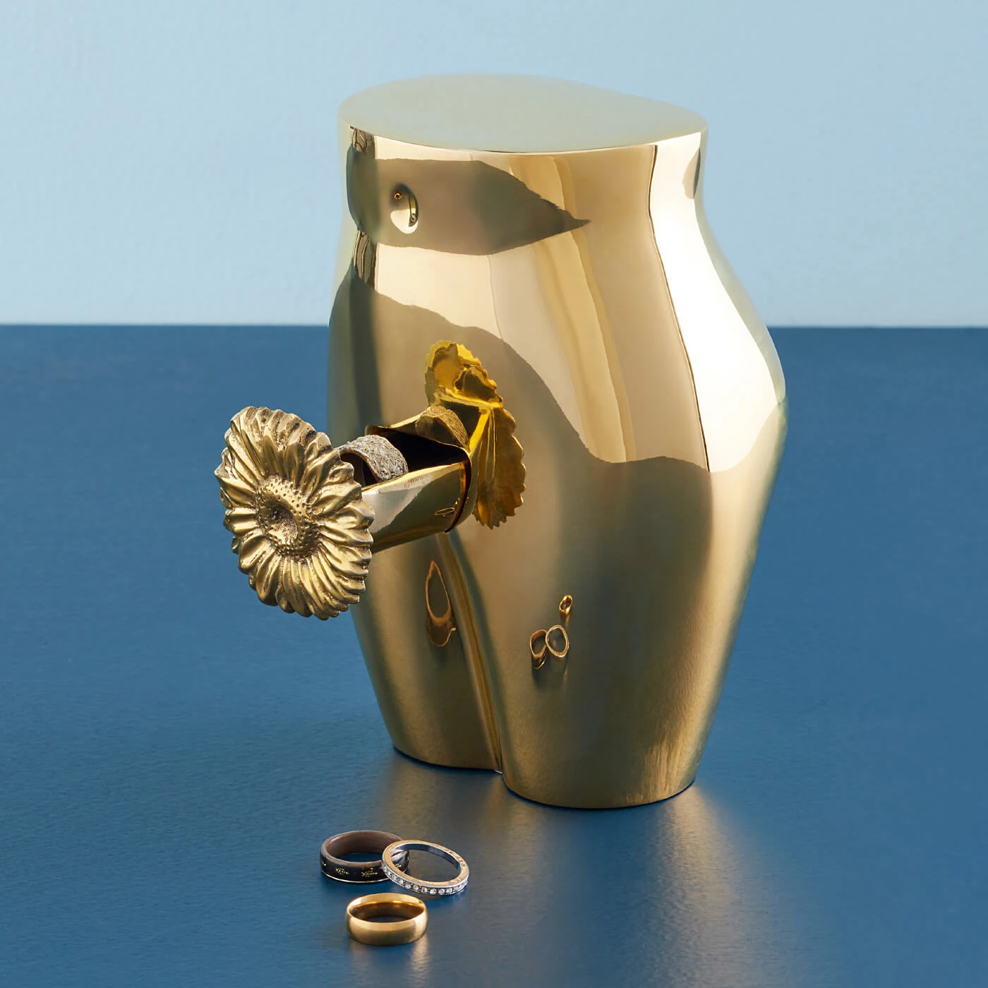 A provocative spot to stash your jewels, our Brass Edie Ring Box’s glowing curves frame a flower that pulls out to reveal a hidden, velvet-lined drawer. Hand-cast in solid brass from a clay model sculpted by Jonathan and his team in our Soho studio.