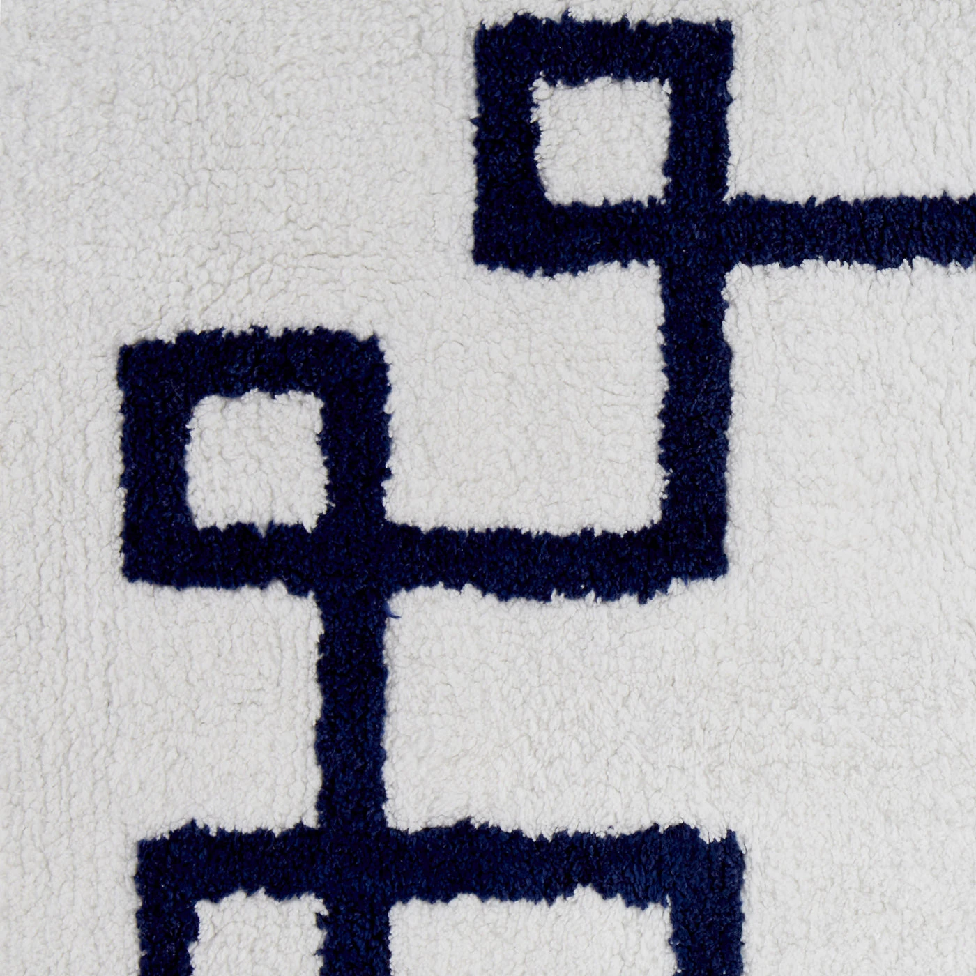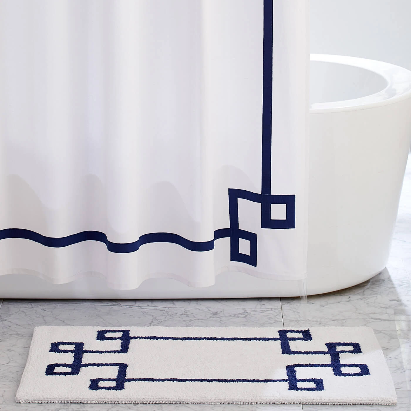 Bright white with a deep navy border, our Campaign Bath Rug keeps it chic and classique. Match with our Campaign Shower Curtain and accessories collection for a coordinated look.