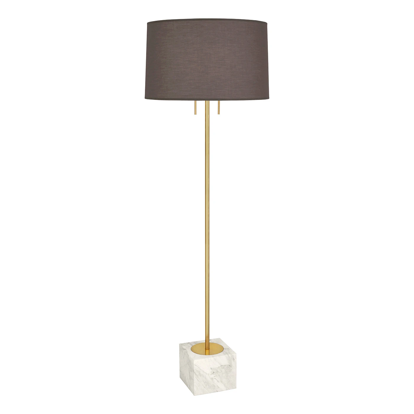 A generous cube of Carrara or Marquina marble supports a brass stem and fabric shade with dual brass pulls. Rigorously restrained, fabulously functional, unimpeachably stylish.