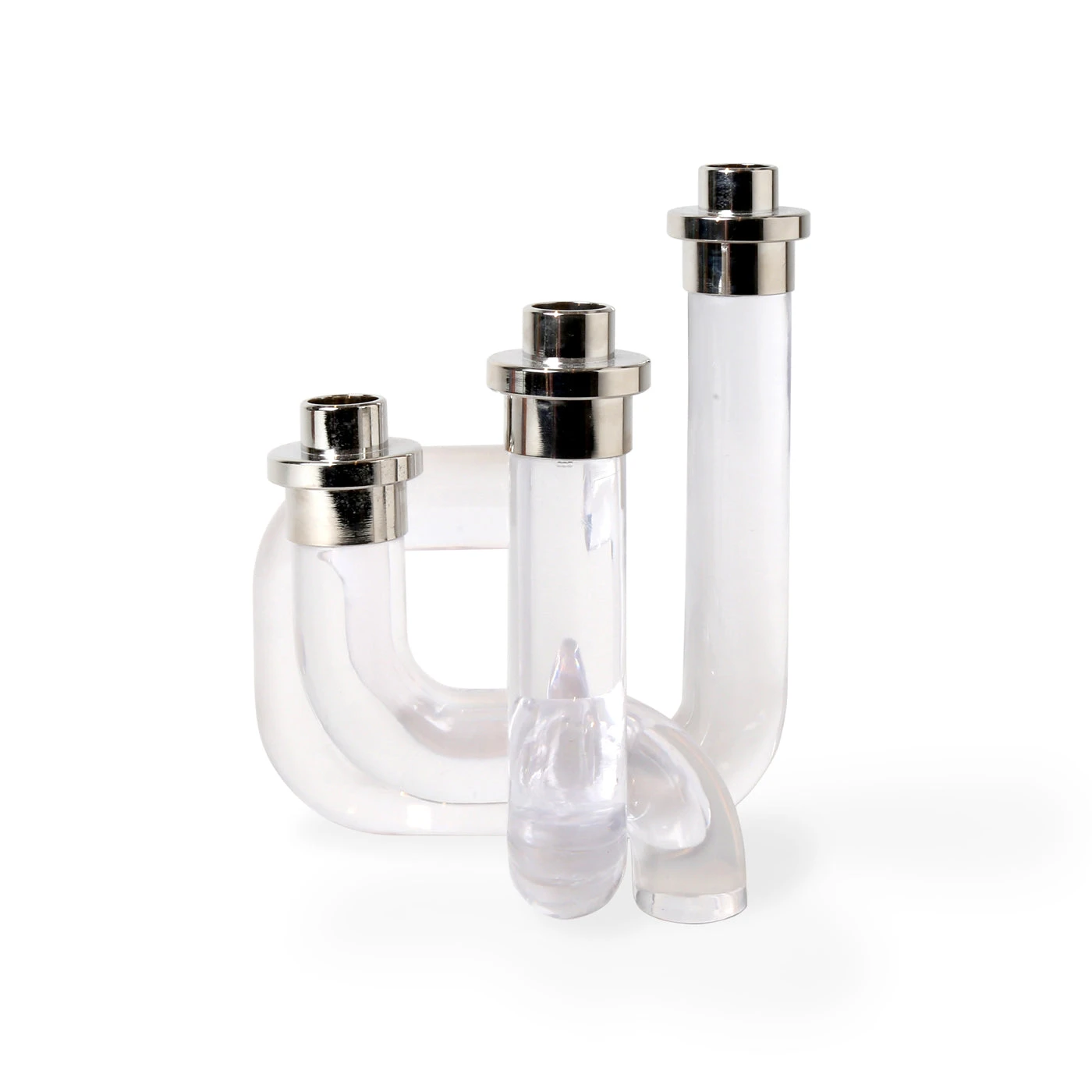 Our Pompidou Candleholders pair 70s-inspired patterns with daring dimension for added ooomph. Featuring solid acrylic pipes fused together and accented with polished nickel. Available in a chic clear or a bold primary colorway for a modern glow to match any mood.
