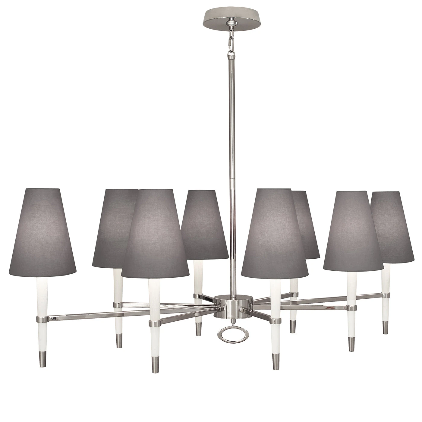 An elevated classic made from ebonized wood with antiqued brass or polished nickel accents. Our Ventana Oval Chandelier hangs handsomely with a touch of twinkle, topped with natural linen shades.