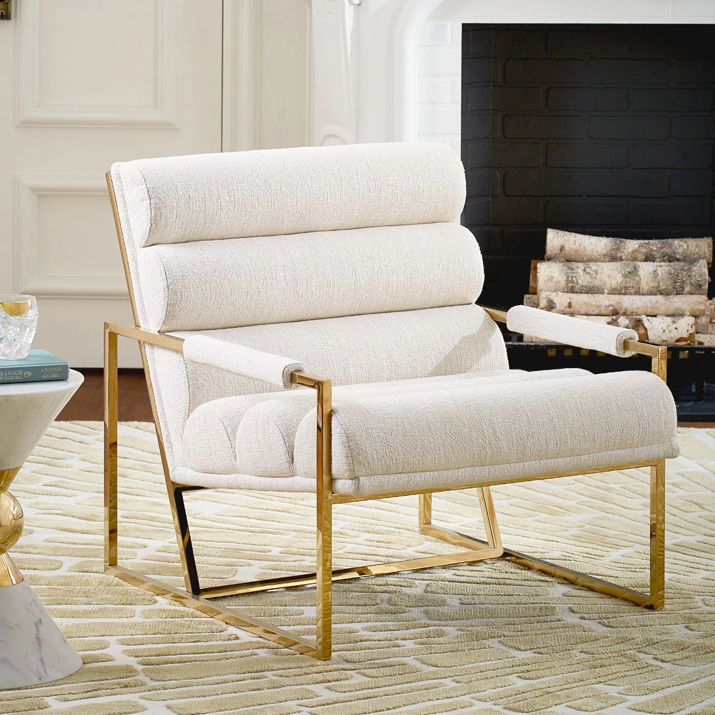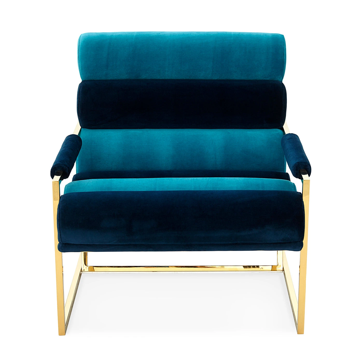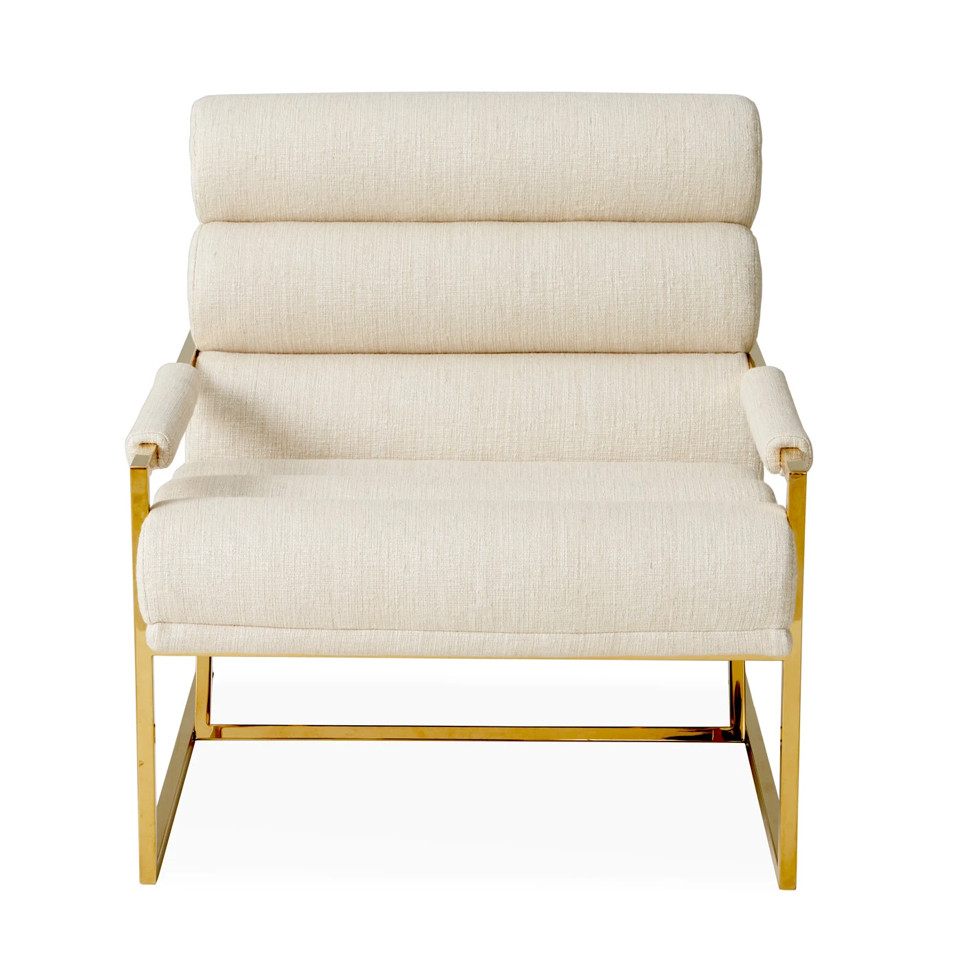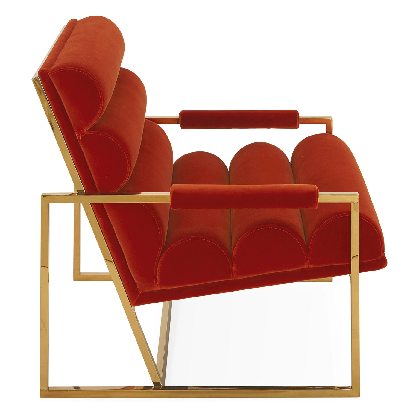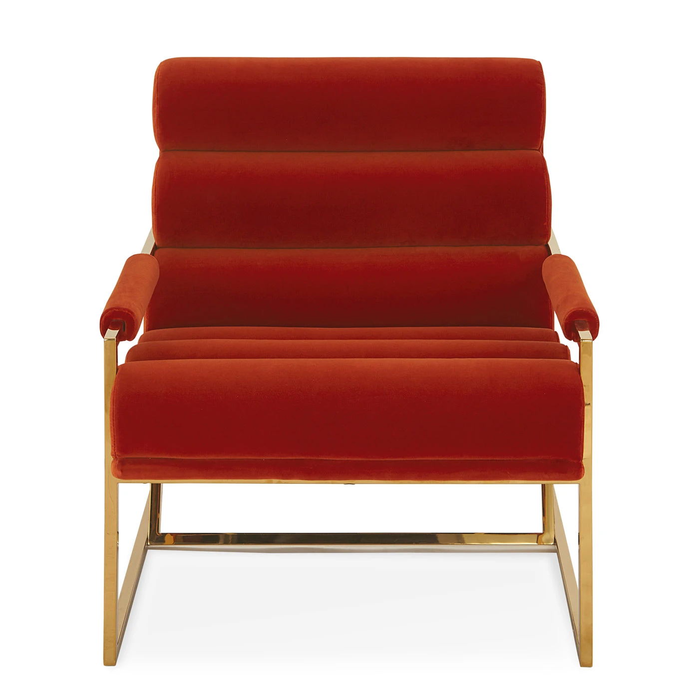 Minimalist comfort gets a modernist makeover—we’ve taken our definition of leaned-back luxury to the next level with our Channeled Goldfinger Lounge Chair. Ultra-comfy channeled cushions and plush arm rests complement its perfect pitch on a pared down, polished brass frame. A bold burnt orange velvet turns up the glam, alternating blues feel seaside chic, or a fresh textural finish takes neutral to the next level.