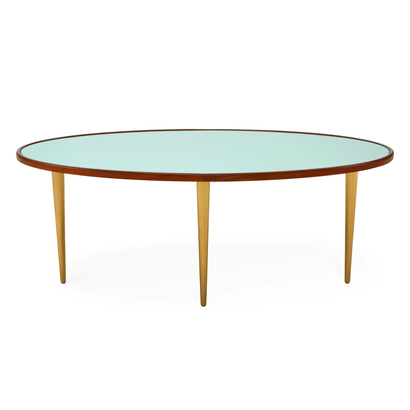 The perfect petite cocktail table, our oval Monterey table features a celadon back painted glass top treated to a solid mahogany edge. Perched on polished brass stiletto legs for extra shine, our Monterey Cocktail Table is fab in front of your sofa.