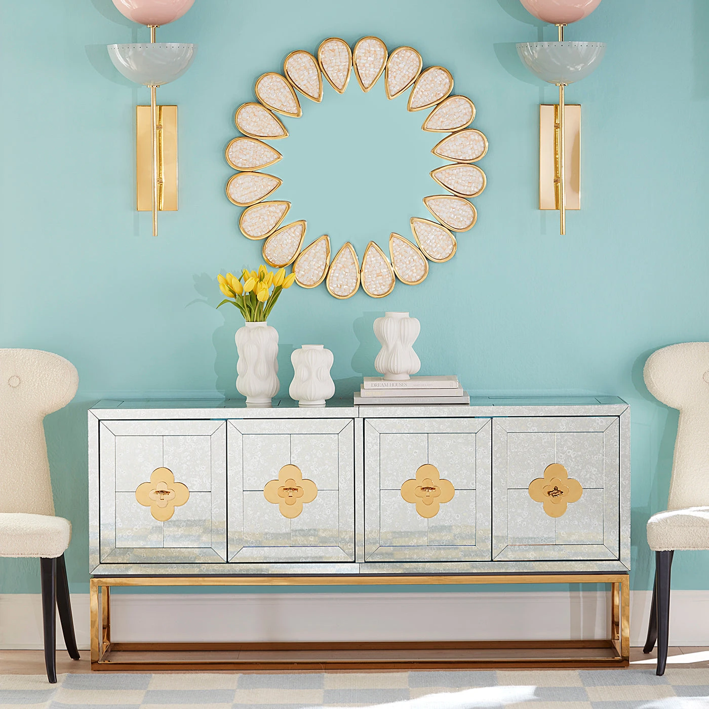 Minimalist forms meet Maximalist glamour. Antiqued mirror with a polished brass base. Two double-door compartments open to reveal a bright robin’s egg blue interior fitted with two adjustable shelves. Quatrefoil handles and escutcheons add a decorative flourish to the simple form.
