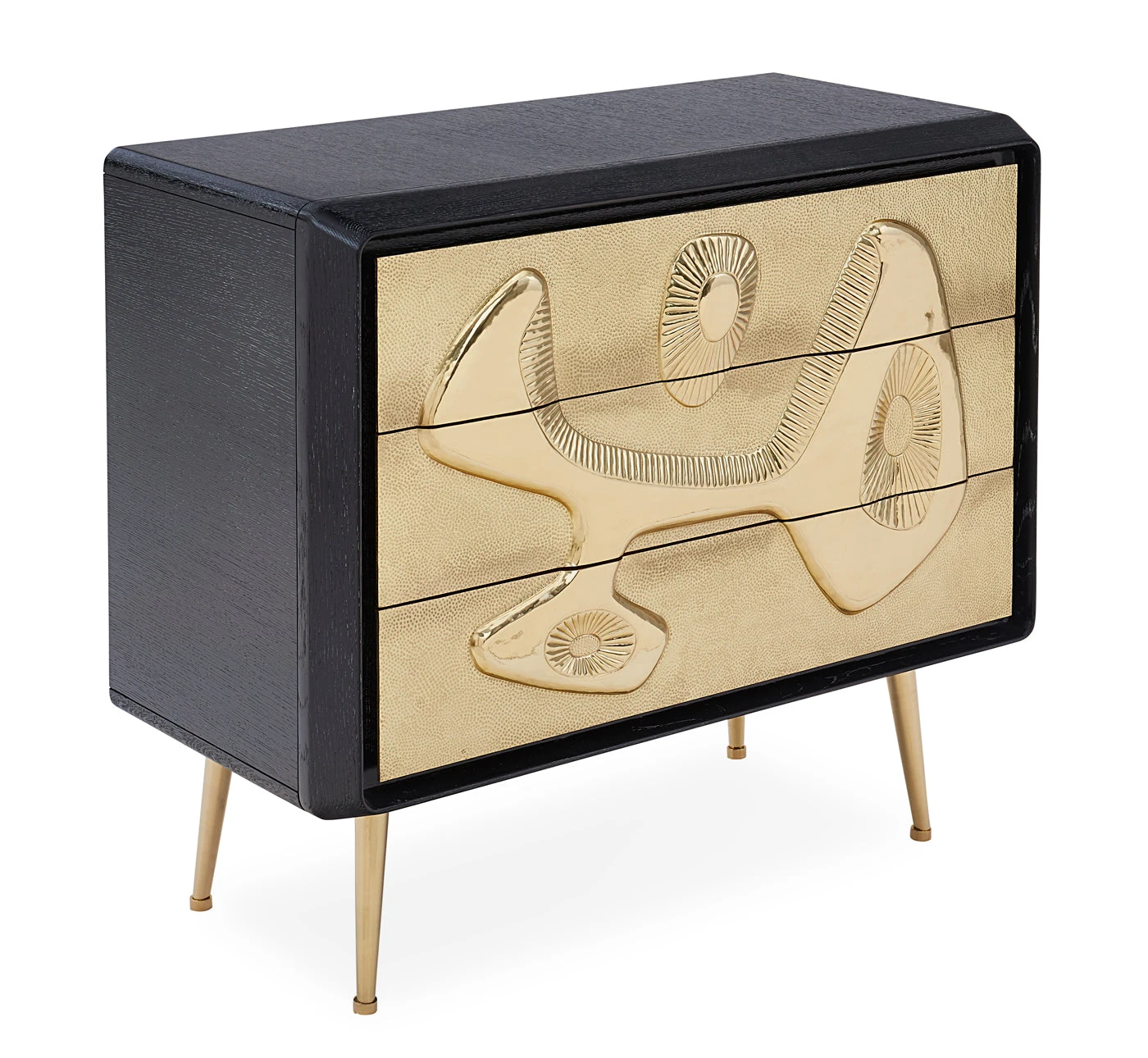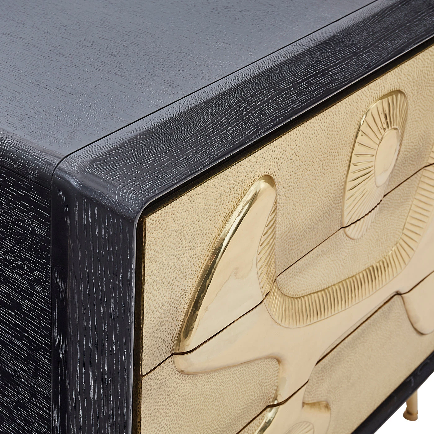 An ebonized and limed oak cabinet with drawer faces featuring our signature Reform design—a relief texture originally sculpted in our Soho pottery studio—clad in a sheet of brass, then hand-hammered and polished to perfection.