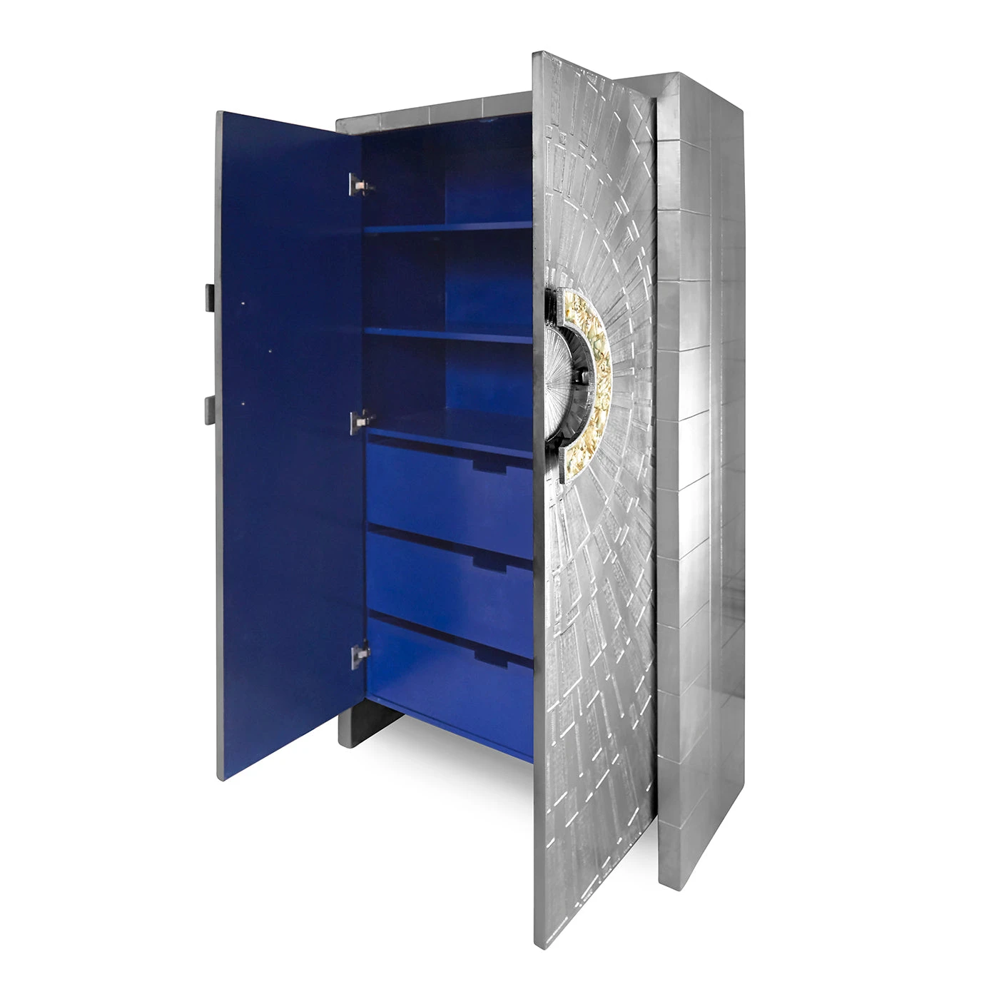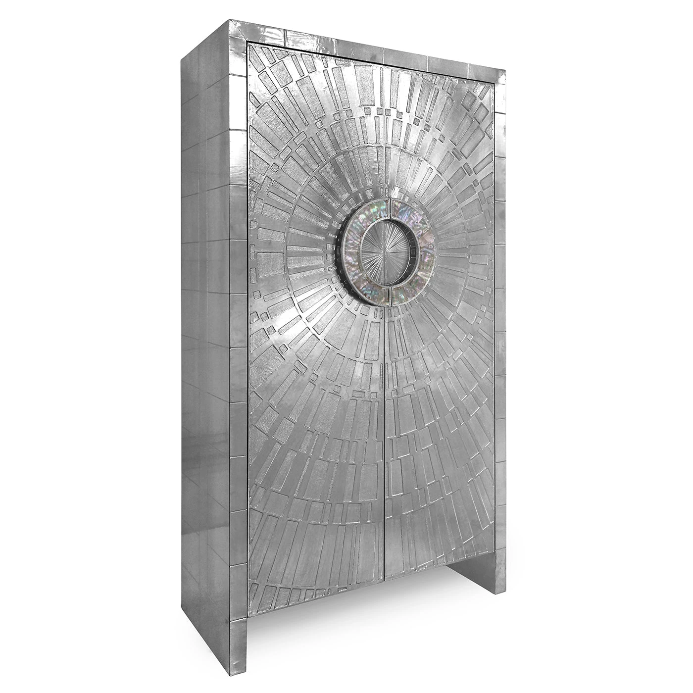 Our Talitha collection is crafted from nickel-plated metal with hand-stamped patterns applied to minimalist, modernist forms. The surface is reminiscent of silver leaf—it emits that same lustrous glow—but is wonderfully durable. Jewelry for your home, our armoire’s doors feature an organic, modern starburst pattern capped with pulls featuring a luminous, hand-cut abalone shell mosaic (due to the use of natural materials, colors will vary). Fitted with three drawers and two adjustable shelves, it’s a must for closet-challenged dwellings.