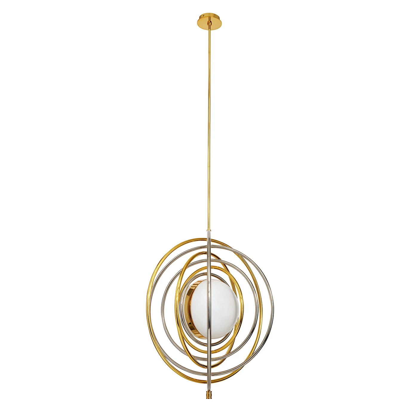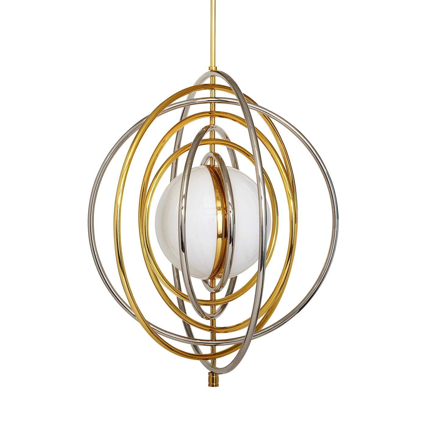 The perfect blend of minimalism and modernism. A glowing orb surrounded by Space Age-inspired rings of polished brass and nickel. The movable rings offer endless versatility: flatten the rings into concentric circles for a clean graphic vibe, or send them into orbit for a groovy-yet-oddly-traditional feel.