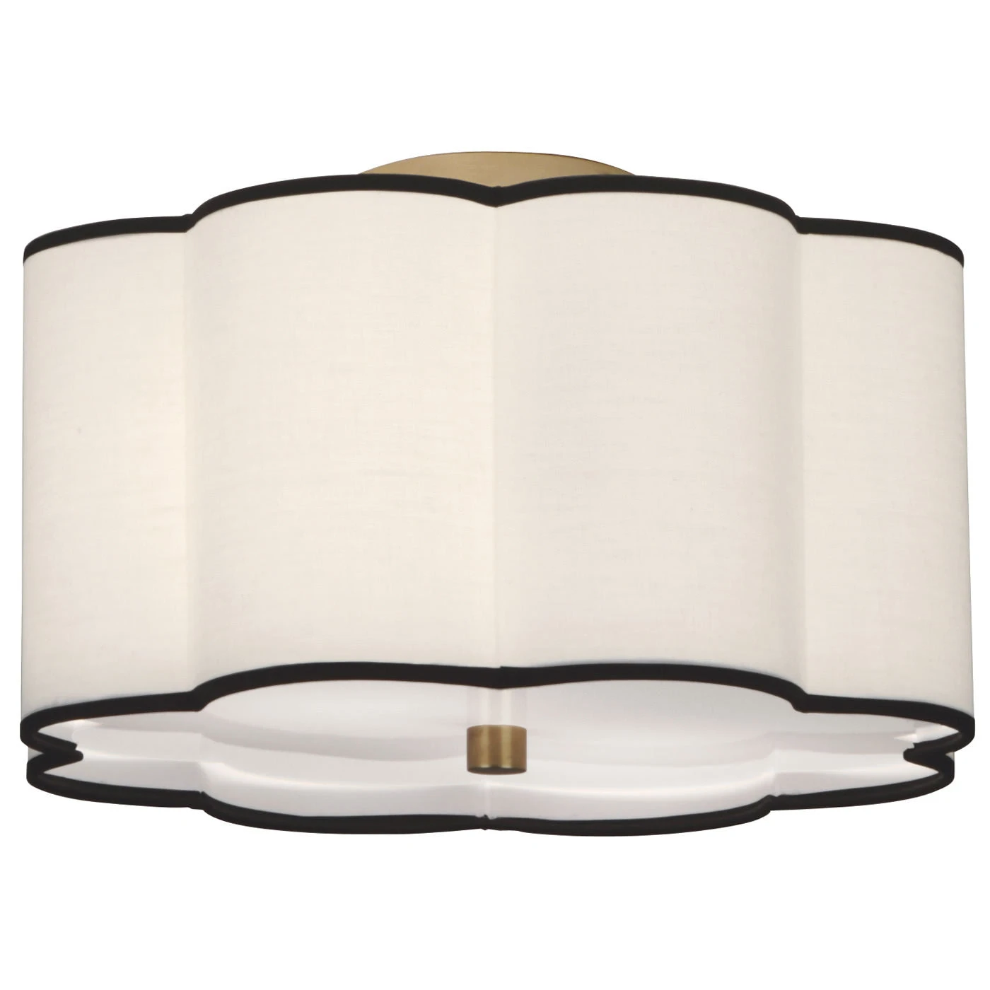 Our Axis Flush Mount is a polished mix of finishes and textures. The scalloped shade with contrasting trim adds a preppy vibe, and the feminine lines give it a French ’40s feel. An acrylic diffuser halts harsh glare.