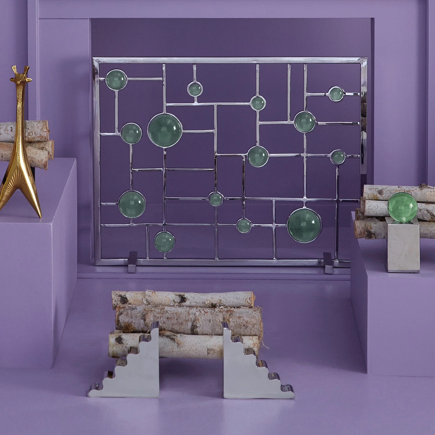 Glowing and glamorous, our Globo Fire Screen features polished nickel fretwork dotted with gem-like tempered glass orbs. Designed to stoke style at the flashiest point in the room, our fireplace accessories give your logs a lift and pretty up your place.