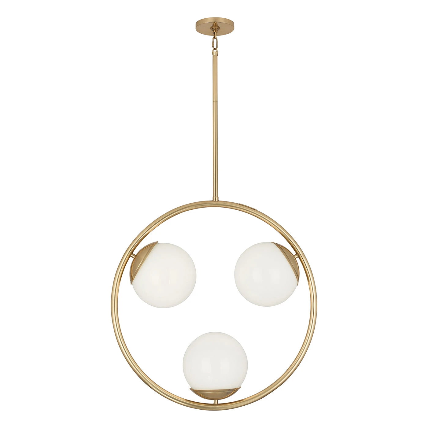 Our minimalist Jupiter Chandelier features three bulbs inside a modern brass or polished nickel circle. Its perfect proportions and large scale bring a bold glow to your dining room, or give a graphic greeting in your entryway.