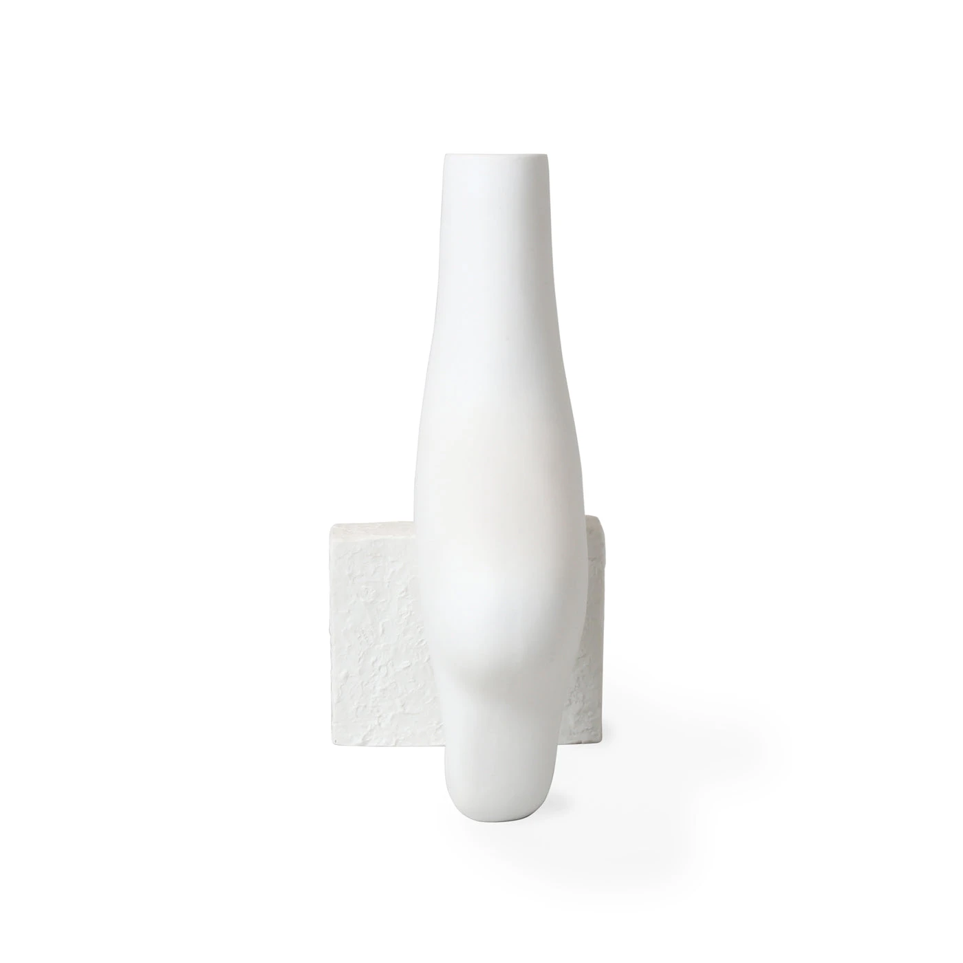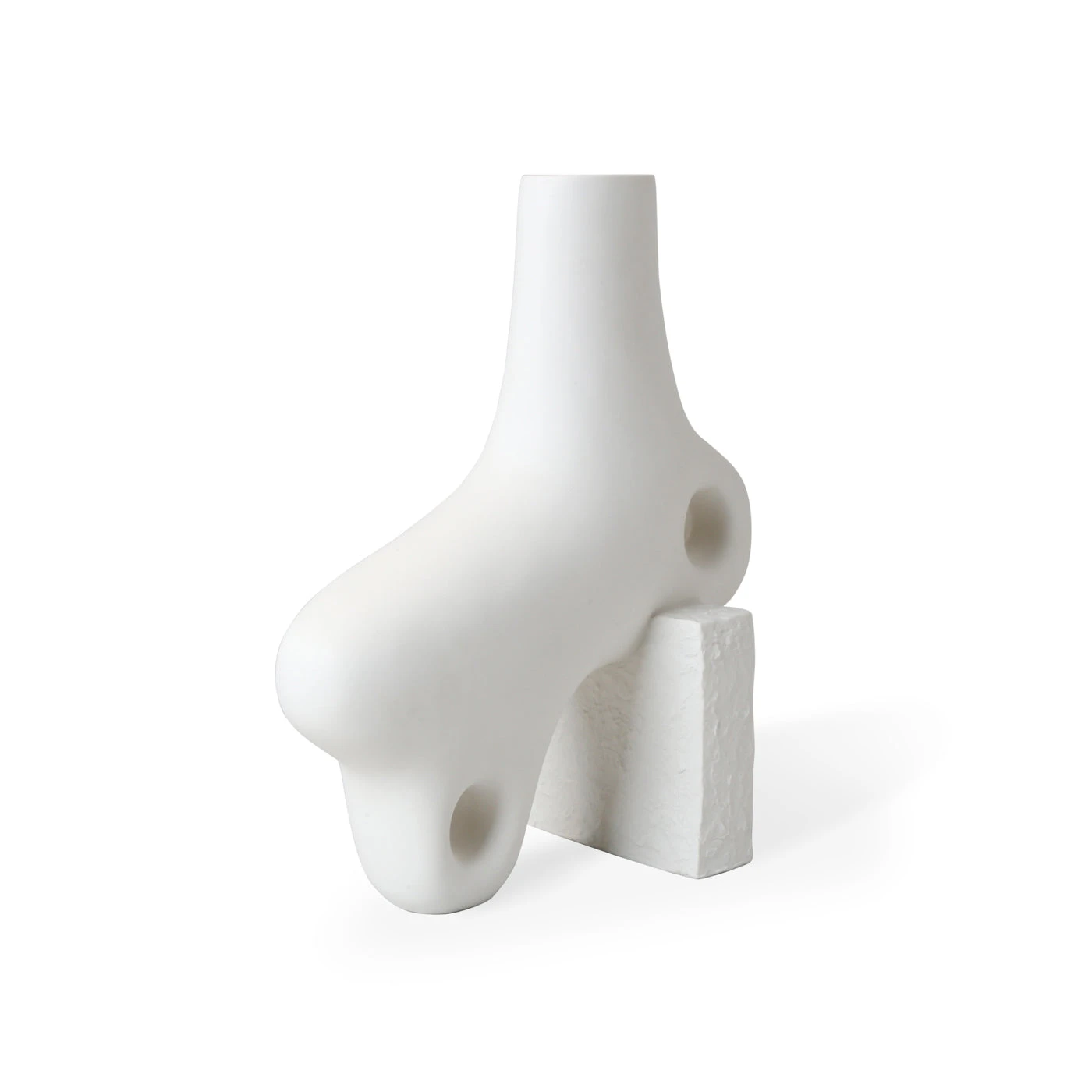 Functional sculptures featuring smooth organic forms intersecting with rough-textured blocks of porcelain. The perfect place for colorful buds to pop, they also make a strong statement without.