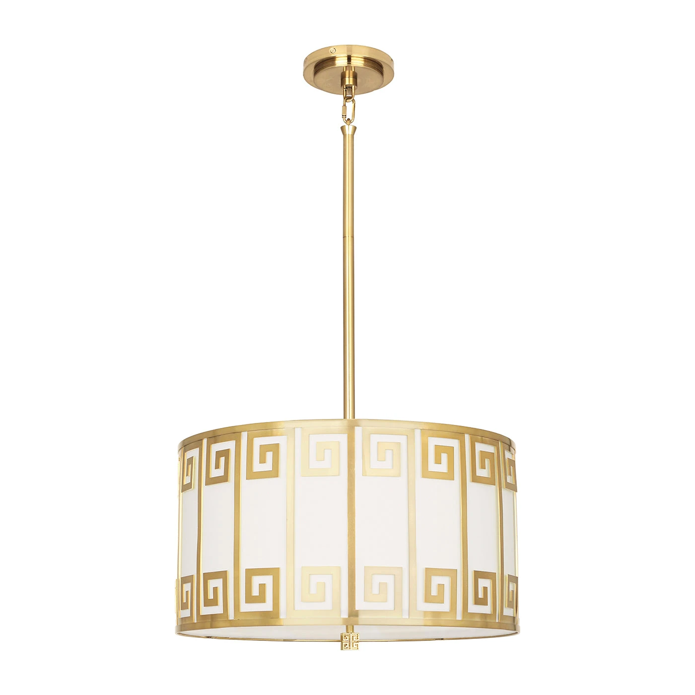 An abstracted nod to the Greek Key, our Mykonos Pendant is an updated take on the classic style. In polished brass or nickel, our signature dual key shape rings all the way around a white shade—the perfect pick for a preppy Palm Beach moment.