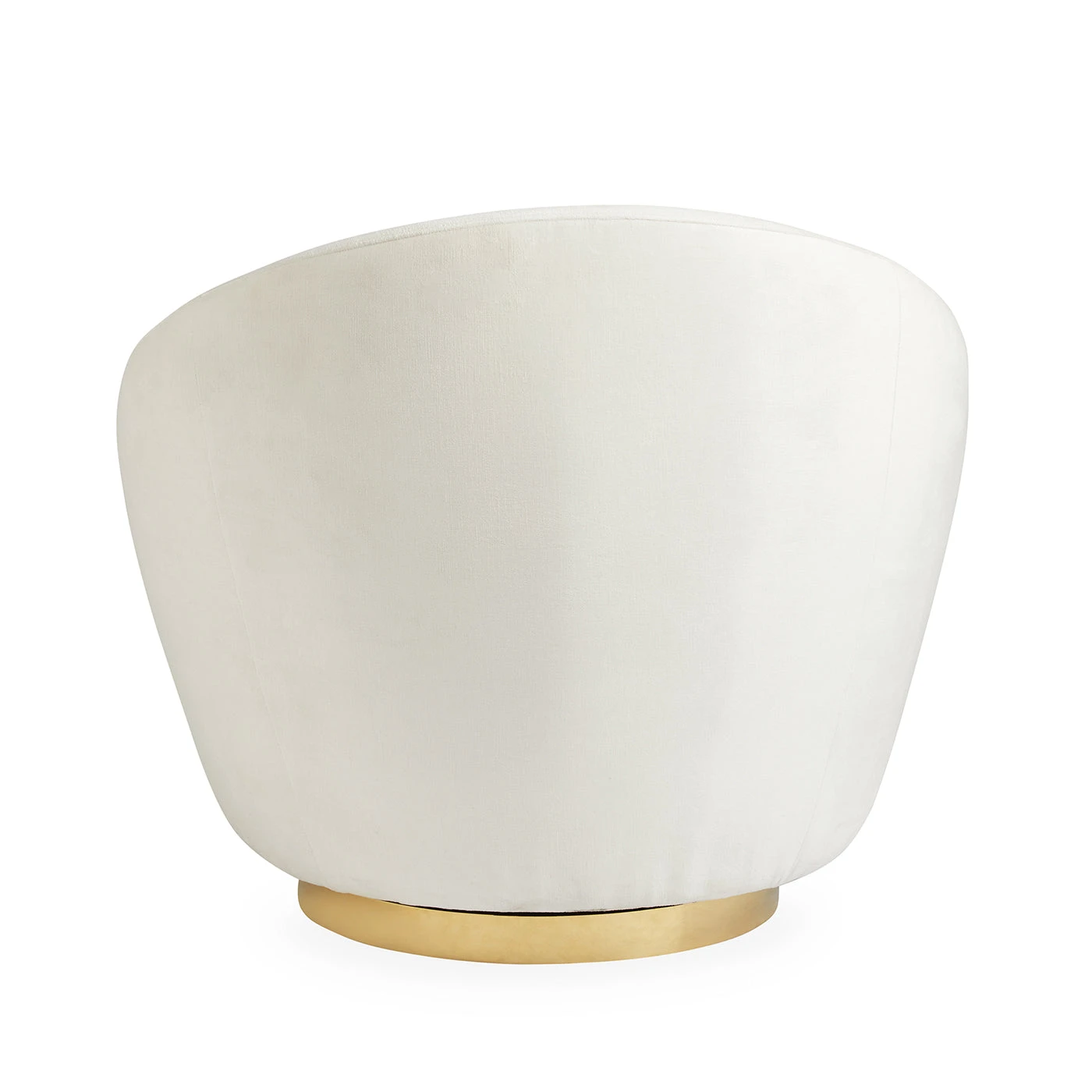 Our signature Ether Chair silhouette perched atop a twinkly brass recessed base. Pairing the capsule-inspired silhouette with the ultimate swivel-rocker experience catapults cocoon-y comfort to the next level. But be warned: you’ll never get out of this chair. Elegant (and exceptionally hardworking) Bergamo Snow or Bergamo Charcoal velvet finishes off the cozy and kinetic fabulousness.