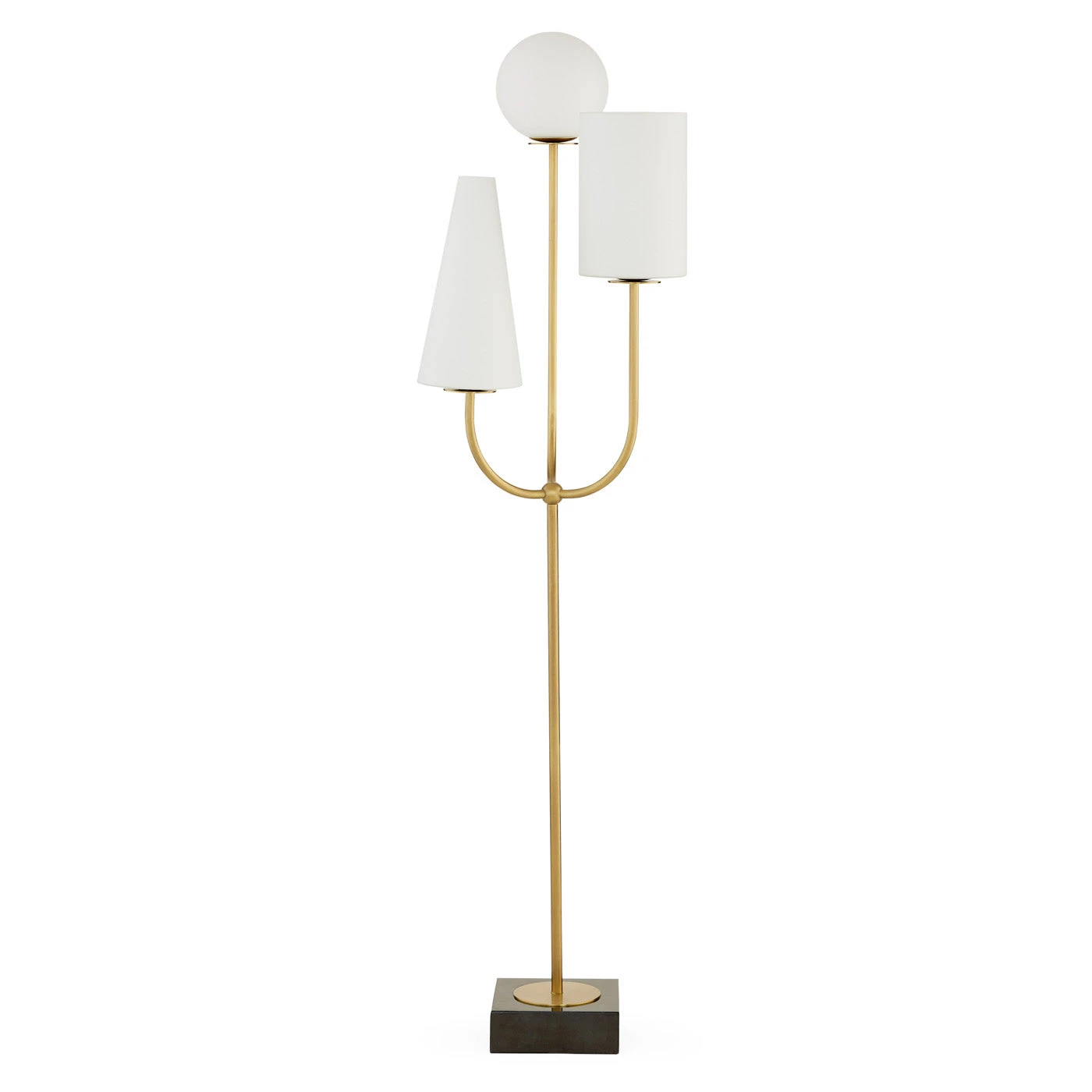Featuring a trio of honed milk glass shades and cactus inspired brass tube framework anchored by a thick black marble base. A clean, modernist choice with subtle, elevating detail—each shade is balanced by a tooled brass plate on its underside—our Paradiso lighting collection uses illuminating minimalist shapes to glow up your space.