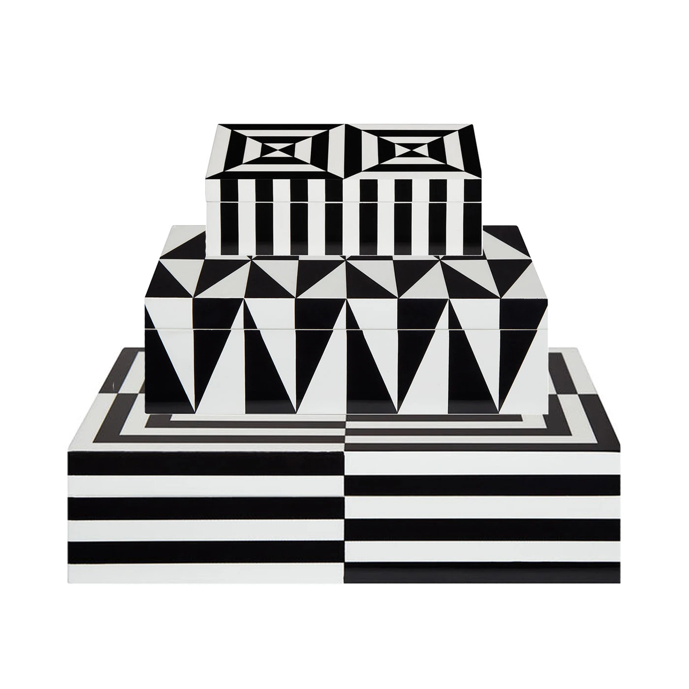 Mind-bending, hand-finished patterns in glam and glossy, high-contrast lacquer—our Op Art Lacquer Boxes POP. Keep your possessions handy but hidden while you luxe up your shelf, mantel, or tablescape. Three sizes for stashing, stacking, or making a stand-alone statement.