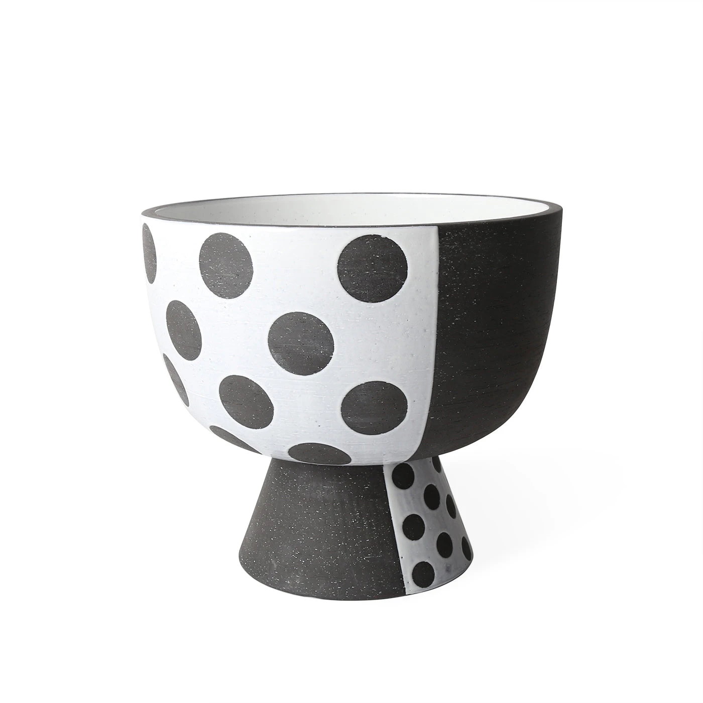 Crafty yet couture, graphic yet organic—our Palm Springs vases bear the marks of rigorous craftsmanship: Hand-thrown by skilled artisans in our Peruvian workshop, each vessel starts with black stoneware infused with chunky grog and trimmed and chattered* to create a striated texture. Linear graphic patterns are hand applied using tape and wax resist and finished with a satin-matte ivory glaze.