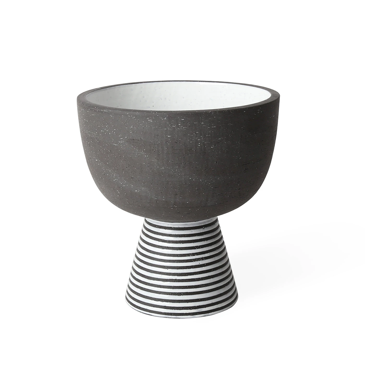 Crafty yet couture, graphic yet organic—our Palm Springs vases bear the marks of rigorous craftsmanship: Hand-thrown by skilled artisans in our Peruvian workshop, each vessel starts with black stoneware infused with chunky grog and trimmed and chattered* to create a striated texture. Linear graphic patterns are hand applied using tape and wax resist and finished with a satin-matte ivory glaze.