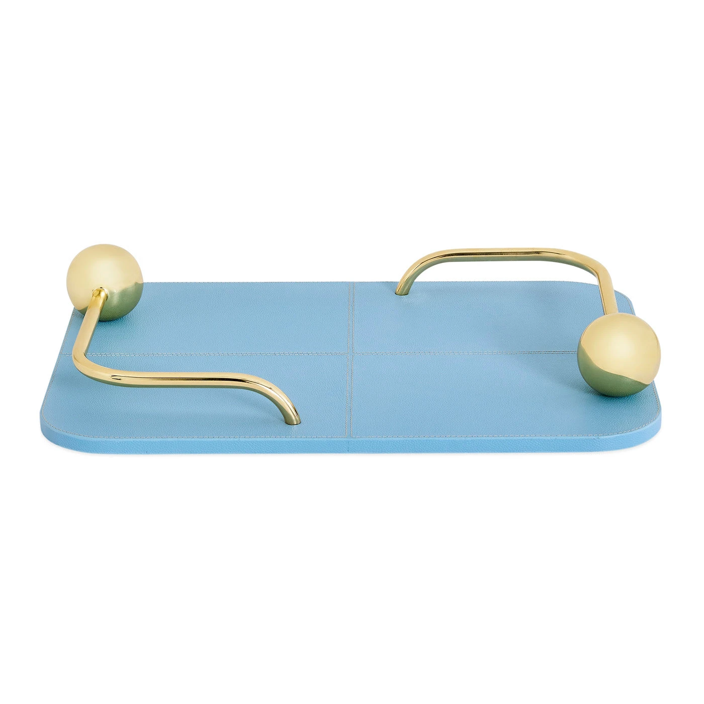 Our St. Germain leather-wrapped tray has a soft, supple finish in a light blue hue with timeless contrast stitching. Featuring two polished brass rails with ball handles for a modernist touch. The perfect accessory for an ottoman or cocktail table, it looks just as chic on your console.