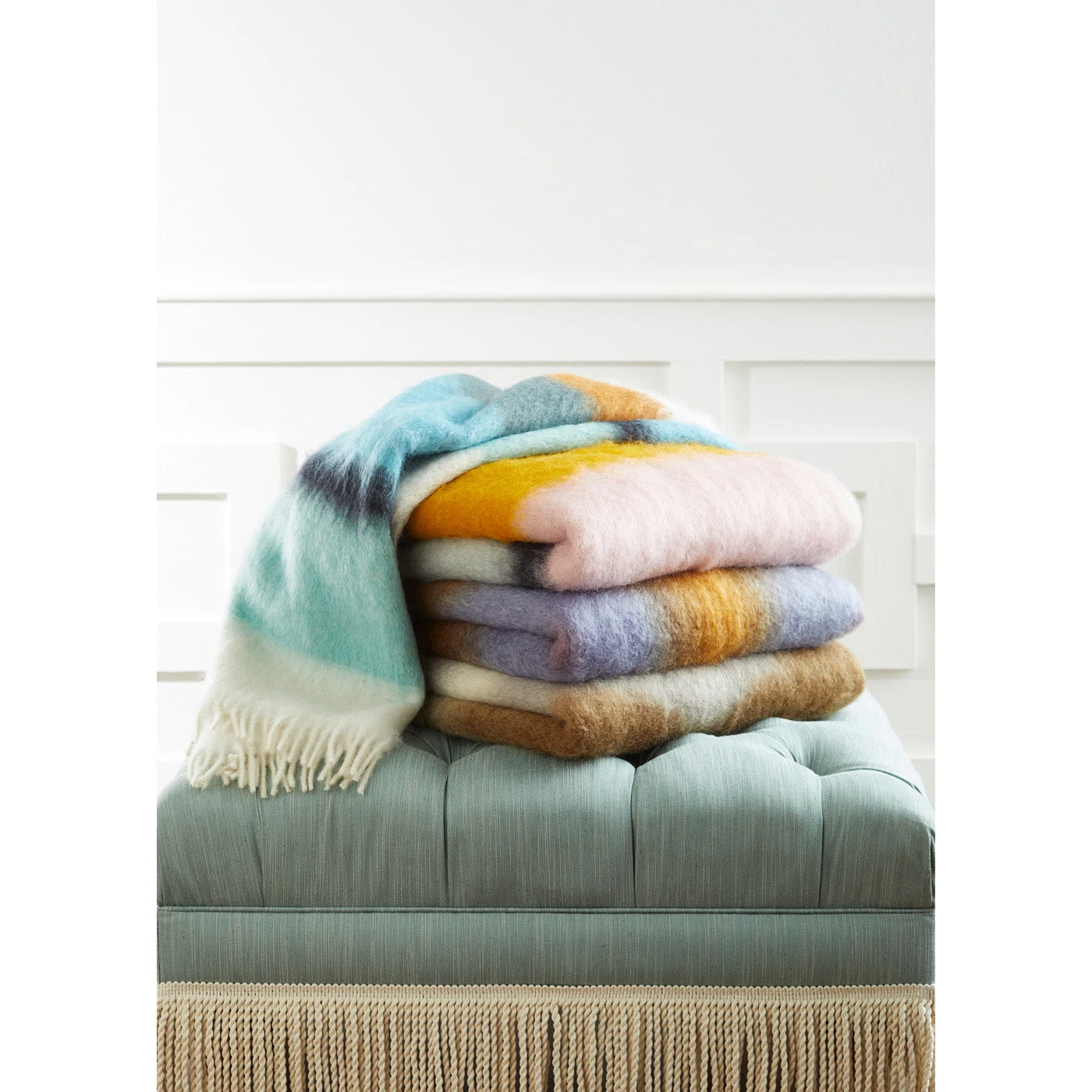 The sheep-to-sofa moment you’ve dreamt about. Sheared, dyed, and woven by hand at a legendary Spanish mill (est. 1930), this soft and cozy mohair and wool blend is cloud-like and dreamy-hued—comfy couture at its chicest.