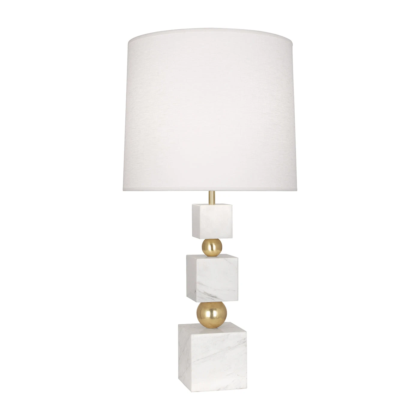 Three blocks of white marble separated by two polished brass orbs to create a stacked pyramid silhouette. Gravity-defying modern glamour topped with an oyster linen or smoke grey fabric shade. Singular on a side table or fabulous flanking your bed.