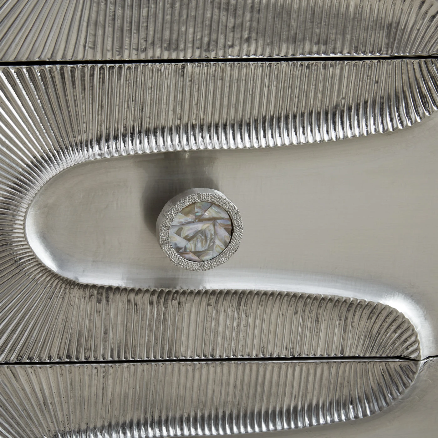 A glam companion in the boudoir, our Talitha Three-Drawer Chest is crafted from nickel-plated metal with hand-stamped patterns applied to a minimalist form. The surface is reminiscent of silver leaf—it emits that same lustrous glow—but is wonderfully durable. Featuring deep, self-close drawers with jewel-like hand-cut abalone inlaid pulls (due to the use of natural materials, colors will vary). Let our signature looping pattern shine in a glamorous lair or read more rock ‘n’ roll in a more minimalist space.