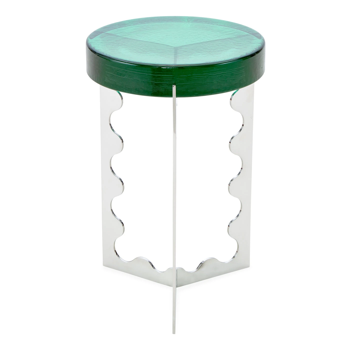 Luxe and luminous tables made from airy nickel bases topped with fabulously thick rounds of cold-cast glass, each featuring a unique pattern of trapped bubble inclusions. Two sizes available: tall with emerald glass, or short with cobalt glass.