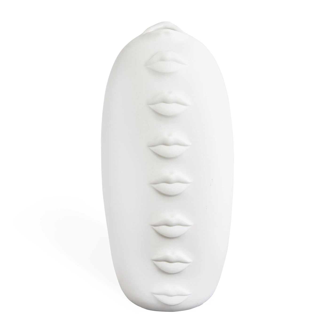 An expressive line-up of moody mouths run down the side of a vessel crafted from unglazed porcelain. A kiss of cool for your table, mantel, or shelf.